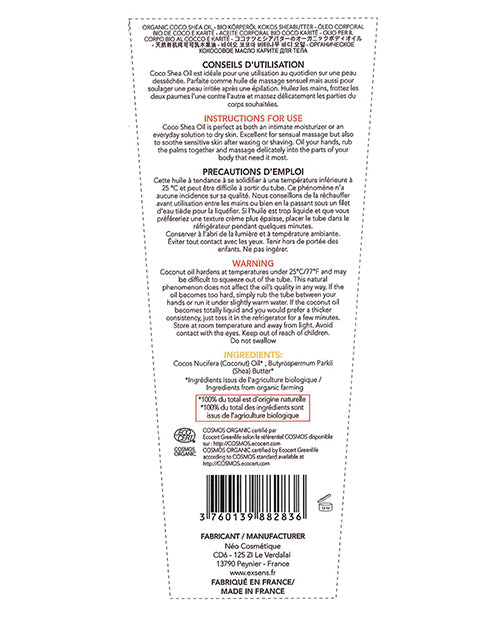 Virgin coco shea oil. Escape on a sensual journey. This oil is ideal for nourishing your skin, with its delightful, all natural scent. Perfect for sensual massage or for use after waxing or shaving, use this all natural body oil wherever dryness is a problem. Ingredients : Cocos nucifera (coconut) oil* , Butyrospermum parkii (shea) butter*